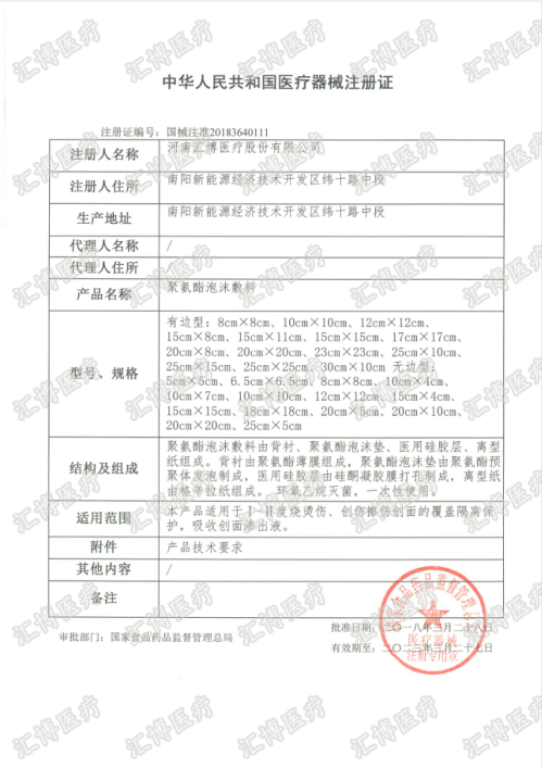 2018年3月28日,从我司知识产权部传来喜讯,公司自主研发生产的聚氨酯泡沫敷料成功取得了国家食品药品监督管理总局颁发的第三类《医疗器械注册证》(注册证号:国械注准20183640111)。